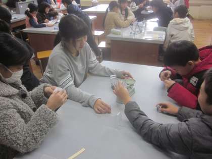 上皿てんびんの使いてんびん方を学習している様子です。