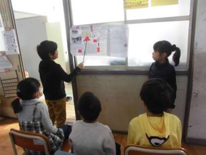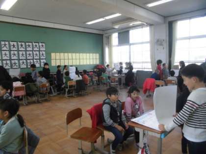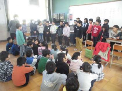 3年生が総合の学習で調べた「京都のお祭りや行事」についての発表をしてくれました。1年生にとっては,少し難しいところもあったようですが,一生懸命聞いていました。特にクイズが楽しかったようです。3年生の発表の仕方では,声の大きさや,指し棒で指ししめすなどさすが!と思わされる場面がたくさんありました。異学年交流を通して,いろいろなことを学んでくれると嬉しいです。