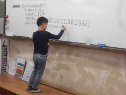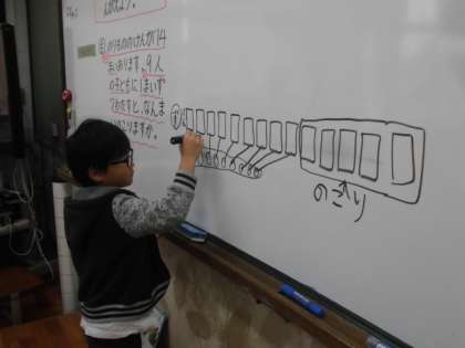人をものに置き換えて考える問題に取り組みました。どんな図にすればよいのかが難しく,何人もでつけたしながら考えました。難しかったようですが,最後はすっきりしたようでした。