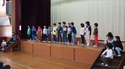 12月19日(木)朱六タイムを行いました。この日は1年生の発表です。1年生は生活科で、朱六小の校庭で季節ごとに見つけたもので工夫しておもちゃを作ったりしています。今回は秋に見つけたドングリや松ぼっくりを使って、マラカスやけん玉など自分たちで作った作品の発表しました。さまざまな工夫に聞いていた子どもたちもびっくりした様子です。1年生も入学して9か月です。いろんなことができるようになってきました。