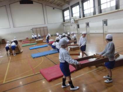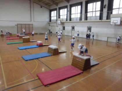 跳び箱の学習も今週で終わりです。ねらい2では,高さに挑戦しています。5段の開脚跳びを最終目標にがんばっています。準備や片付けも協力してテキパキできるようになりました。