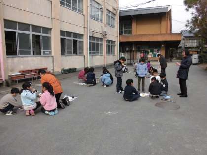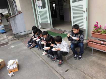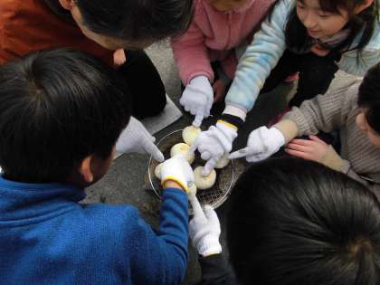 地域の方々にお世話になって,もち焼き体験をしました。1学期に昔の道具で七輪を学習しましたが,今日は実際に七輪を使ってお餅を焼きました。地域のゲストティーチャーの方が手際よく火を起こしてくださり,ふっくらとお餅が焼けました。みんな満足そうに食べていました。11日の餅つき大会の大きなお餅をいただきました。ごちそうさまでした。