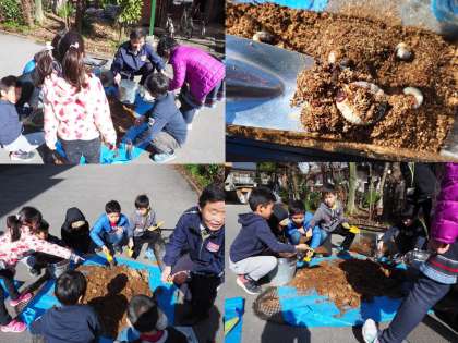 1月29日(水)朱六小のお昼休みの風景です。朱六の森の前では、3年生の子どもたちと教頭先生が、カブトムシの幼虫の入ったケースの中の土を掃除しています。最初小さかったカブトムシの幼虫たちは、10cm近くの大きさに成長してきました。その分中の土も汚れてきますので、掃除しないといけません。陽だまりの中で、教頭先生と一緒に3年生の子どもたちは興味津津で、土の掃除をしています。