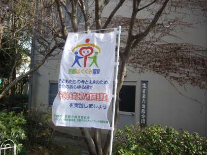 2月5日は「京都はぐくみ憲章の日」です。シンボルマークの「憲章のぼり」を立ててアピールしました。京都市では,毎年2月5日を「憲章の日」として定め,子どもを笑顔で温かく見守り,地域や社会の宝として大切に育む「はぐくみ文化」が息づくまちづくりが進められています。