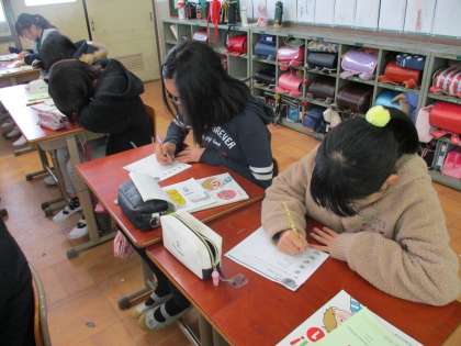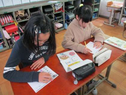食べ物を大文字や小文字で書く練習をしている様子です。