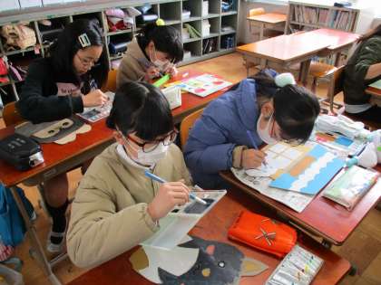 作品展で展示する伝言板を作っている様子です。