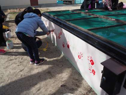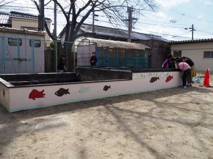 2月19日(水)朱六校のグラウンドの南側にある水槽の壁が汚れていたので管理用務員さんがペンキで塗りなおしてもらいました。表面に描かれていたお魚の絵も鮮やかによみがえり、裏側には手形アートも出現しました。