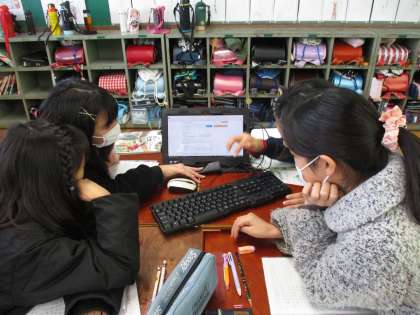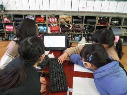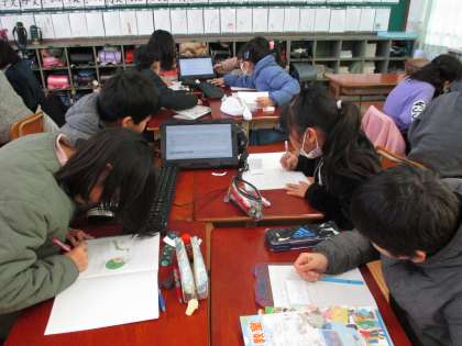 グループでタブレットを使って日本の森林について調べています。