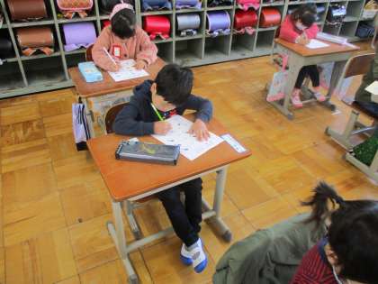 2時間目には,正しい姿勢や正しいえんぴつの持ち方の学習をしました。正しいしせいの合言葉は,「足はぺったん,背中はぴん,おなかとせなかにぐうひとつ!」です。えんぴつは,「つまんでぎゅん,おにいさんまくら」で練習しました。覚えた後には,線がきの練習をしました。スタートやゴールのお話もしっかり聞いていて,しっかり学習できました。また練習しようね!