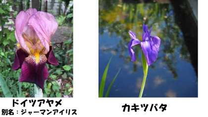 上の写真は,校内で見つけた花です。名前は違うのに,どちらも形が似ていませんか?それもそのはず,どちらもアヤメ科アヤメ属の植物です。アヤメもカキツバタも日本古来の植物です。ドイツアヤメは1800年代の初期,ドイツで品種改良されたアヤメだそうです。