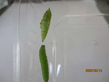 今日は,モンシロチョウのよう虫の姿も変わってきました。もりもりキャベツを食べることをやめたら,体の周りに糸をめぐらせ『さなぎ』になっていました。大きさも『よう虫』のころに比べると少し小さくなったようです。