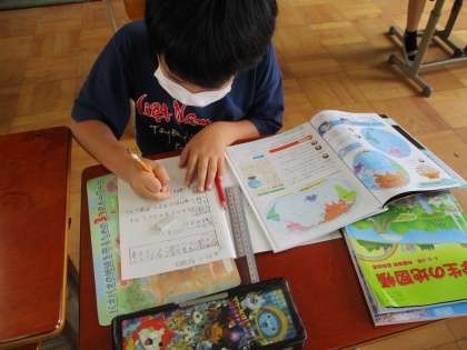 分散登校での学習がスタートしました。社会では,地球の写真や世界地図,地球儀を使って気づいたことや調べたいことをまとめました。地図や地球儀の違いを知ることができました。