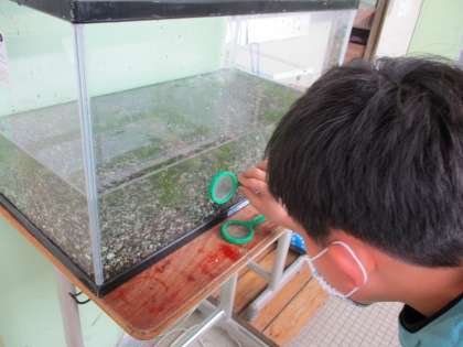 理科の学習「メダカのたんじょう」で観察するメダカが5年生の教室にやってきました。水槽に砂利,水,水草などをセットし,メダカを放しました。早速,虫眼鏡で観察する子も。みんなで大事に育てていきます!
