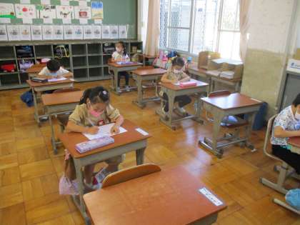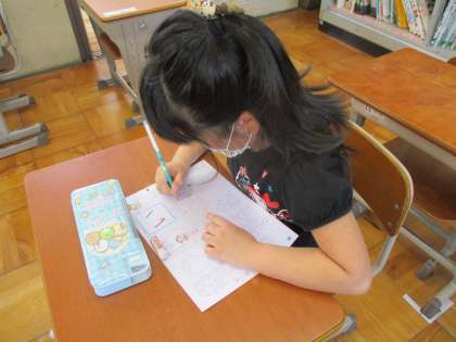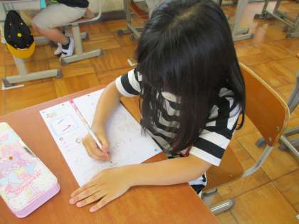 今日は『い』と『こ』です。初めて2画で書くひらがなです。そして初めての『はね』のある字です。「ぴんっ」と唱えながら練習しました。一度とめてから勢いよく跳ねるのは難しそうです。