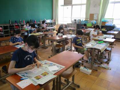 思いのままにかいた形や色から,いろいろな気持ちを見つけました。ドキドキ,悲しい,楽しいなど・・・一人ひとりのもようが違って,また見比べれてみると面白そうです。