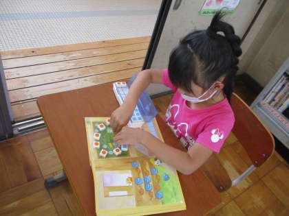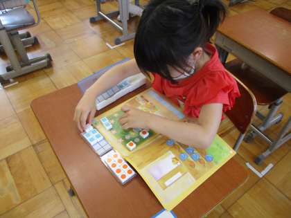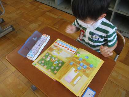 ブロックの数と同じ数のものを絵の中から見つけました。5こあるものは,昨日見つからなかった机やいすも見つかりました。よく見てすごいね!