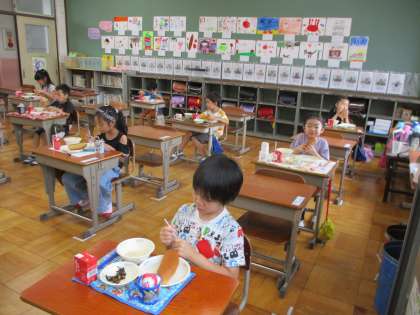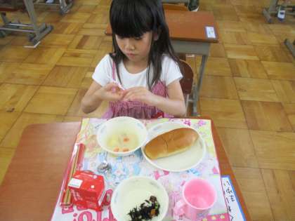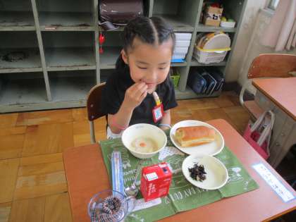 初めてのパン給食でした。大きなパンにびっくりしていましたが,食べてみると黒糖の甘味が広がりペロリと食べきっていました。