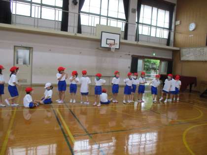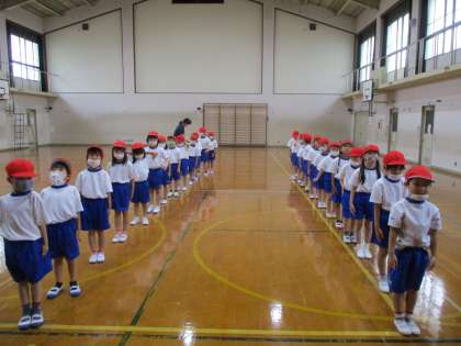 今日の体育は,並び方の練習をしました。名前の順番に友だちに聞きながら並ぶことができました。列を整える練習もしました。