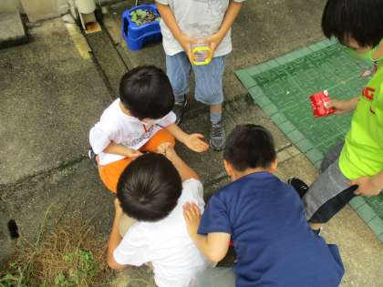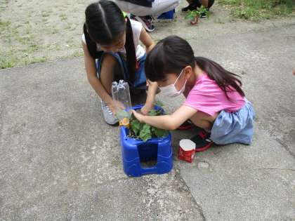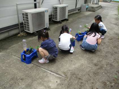 あさがおが成長してきたので間引きをしました。途中でダンゴムシを発見して大喜びの1年生でした。