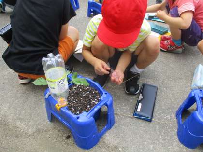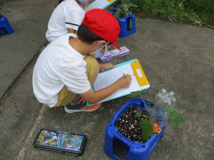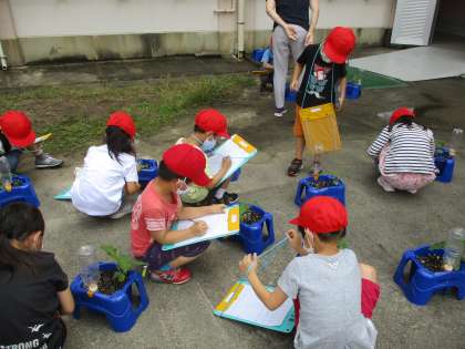 アサガオの肥料をやったり,観察をしたりしました。葉っぱをよく見て絵を描きました。