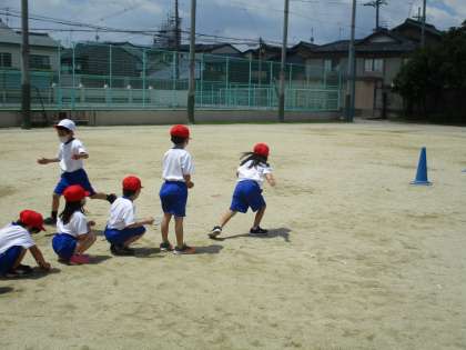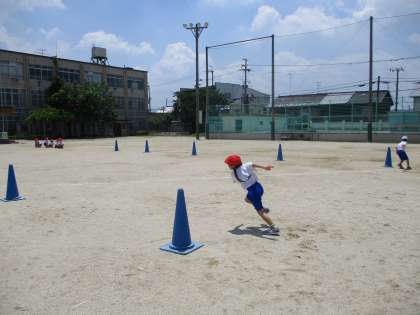 リレーをしました。並んだコーンを交互に回っていくリレーは難しかったようです。