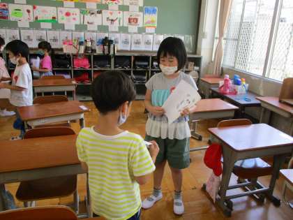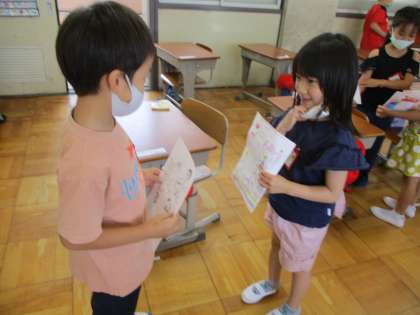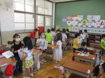 「どうぞよろしく」の学習です。自分の名前と好きなものを書いた用紙を見せながら自己紹介しました。裏には,好きな動物を描き,その理由も伝えました。ちょっぴり恥ずかしそうに伝えていました。