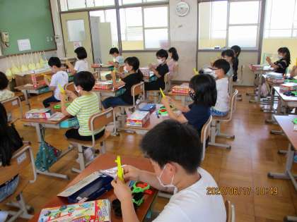 理科の時間に『ゴムや風の力』の学習を始めました。今日は,どのようにゴムを使ったら車を走らせることができるか,遠くまで走らせるにはどうしたらよいかの問題意識をもって楽しく学習しました。