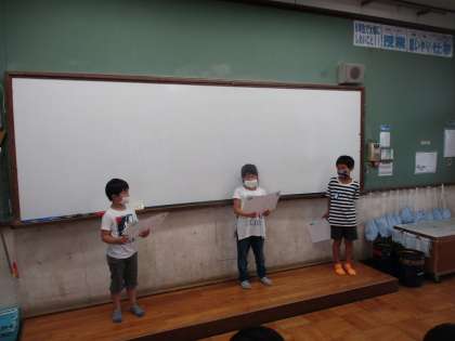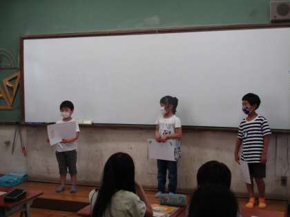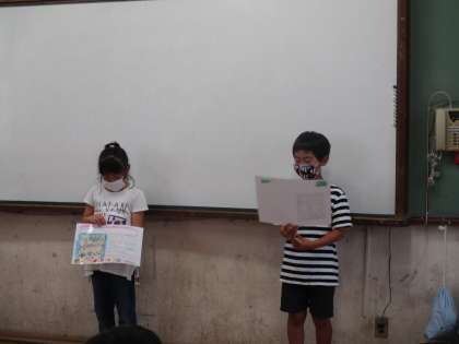 「学校を紹介しよう」の単元で作った教室紹介カードを6年生の前で発表している様子です。