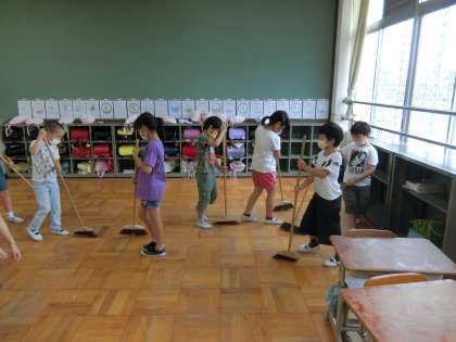 1列に並び,掃除をおこなっています。丁寧に掃除をする姿がみられます。