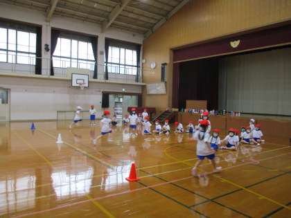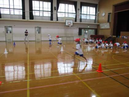 体育館でリレーをしました。コーンを交互に進むくねくねリレーです。前回よりも上手になりました。