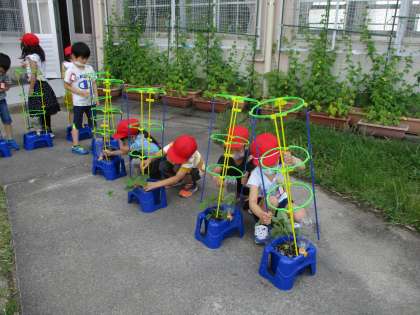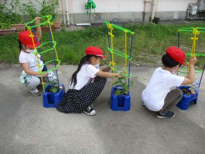 アサガオにつるが出てきました。今日は支柱をたてました。