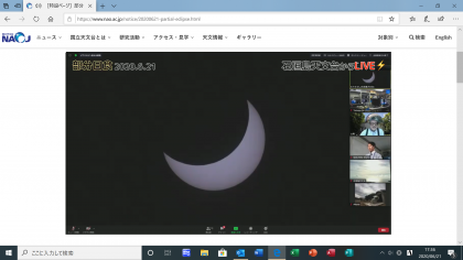 6月21日夏至の日の夕方,部分日蝕という天体の現象がありました。地球から見て太陽の前を月が横切り,太陽の一部が欠けて見える現象です。あいにくの曇り空で,きれいに太陽が欠けている姿を見ることはできませんでした。