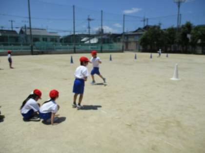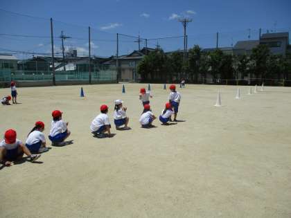 青空の下,リレーをしました。その前に,背の順で並ぶために時間がかかってしまいました。次は今日より素早く並べるといいな。
