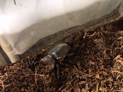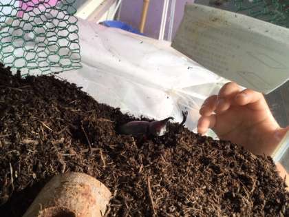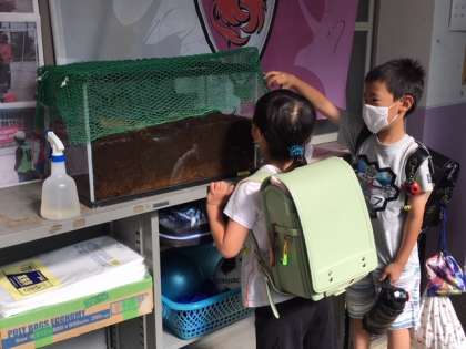 朝から2匹のオスが元気いっぱいでした。一度脱走したので,緑の網が取り付けられています。「見えないなぁ〜」と言っている子には,上級生のお兄さんが網を持ち上げて見せてあげていました。