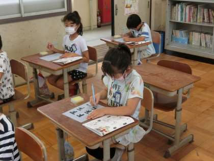 書写では,水書をはじめました。筆で文字を書くのが初めての子もいたようで,緊張しながらも丁寧に書きました。「トン,スー,ピタ」のリズムで文字を書く練習をしました。