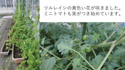 学校では,2年生が1年生に学校の紹介をしました。2年生がお兄さん,お姉さんになってきました。今日は2年生がちょっと大きき見えました。またツルレイシの花,ミニトマトの実がみられるようになりました。
