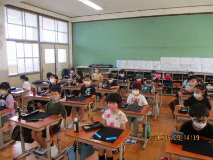 今日,初めて書写に取り組みました。習字をする時の心構えを聞いて,素晴らしい姿勢になりました。道具の使い方や筆の扱い方を学習しました。