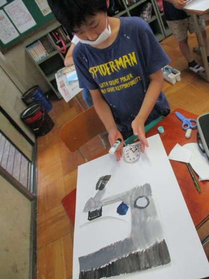 校内にあるお気に入りの場所やものを絵に表しています。破った紙に書いた絵を組み合わせて張り,さらに絵の具で描き加えています。次回,鑑賞会をする予定です。