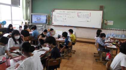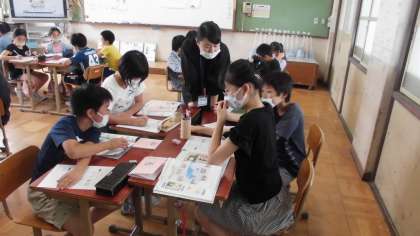 7月2日(木)5年の英語の授業です。マスク着用でのグループトークです。顔を近づけないよう気を使いながら進めていきます。それでもお互いに英語を声に出して学べることは楽しいようです。