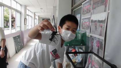 7月2日(木)中間やすみに教頭先生と子どもたちがカブトムシの世話をしています。春先幼虫でしたが,もう立派な成虫です。子どもたちも興味津々です。