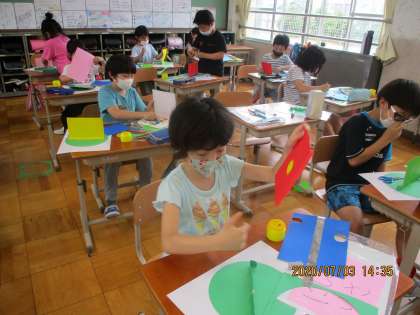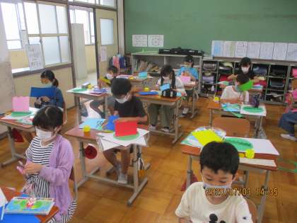 みんなの大好きな工作。割りピンを使って回る仕組みをうまく利用して作ります。どんなクルクルランドができるのか楽しみです。