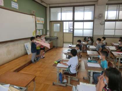 先日,1年生と一緒に学校探検に行き,1年生がお礼の手紙を届けに来てくれました。2年生はとても喜び,全員分読みました。