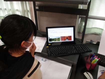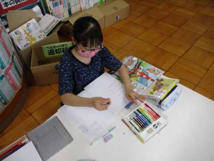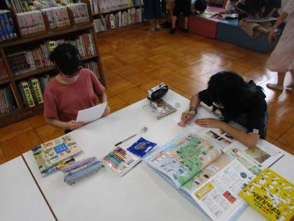 子どもたちがコンピューター室や図書室で学習している様子です。