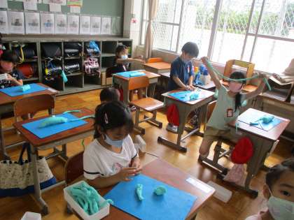 今日の図工の学習は,「ひもひもねんど」です。粘土をひもにして,どんな形ができるかを考えました。