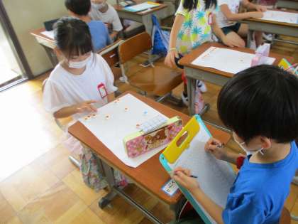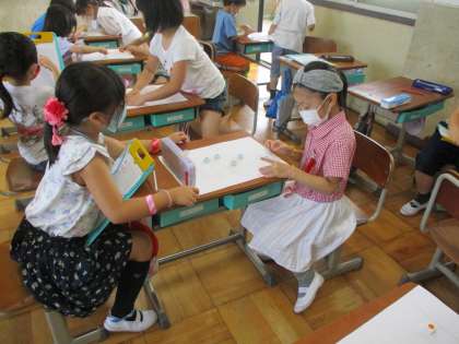 10はいくつといくつにわけられるかを考えるため,おはじきゲームをしました。○のなかにはじいたブロックがいくつはいるのかを友だちとペアになって調べました。