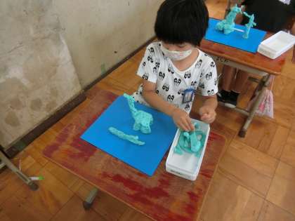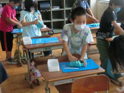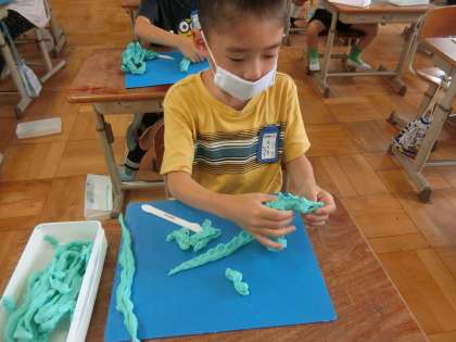 2年生の図工では粘土を使った学習の「にぎにぎねんど」が始まりました。粘土を柔らかくなるまでこねてから,指をつかってさまざまなものを作りました。