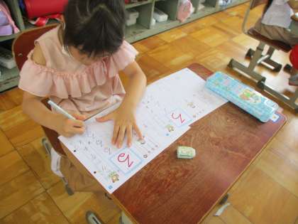 今日は,「ろ」と「る」です。昨日学習した「そ」と書き始めが同じだということに気づいたようです。二つの字の違いに気をつけながら練習していました。