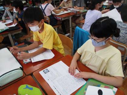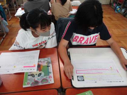 調べたことを班で交流している様子です。