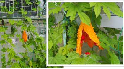 7月15日(水)朱六小のなかでツルレイシの実が赤く熟れて,中から種が見えています。ツルレイシのウリであるゴーヤの中の種は赤いのですね。