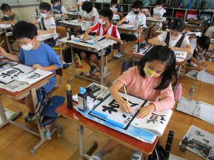 文字の組み立て方と穂先の動きを考え,「道」の字を書きました。一文字ですが,バランスやしんにょうなど難しいポイントがたくさんあったようでした。集中して作品を仕上げることができました。